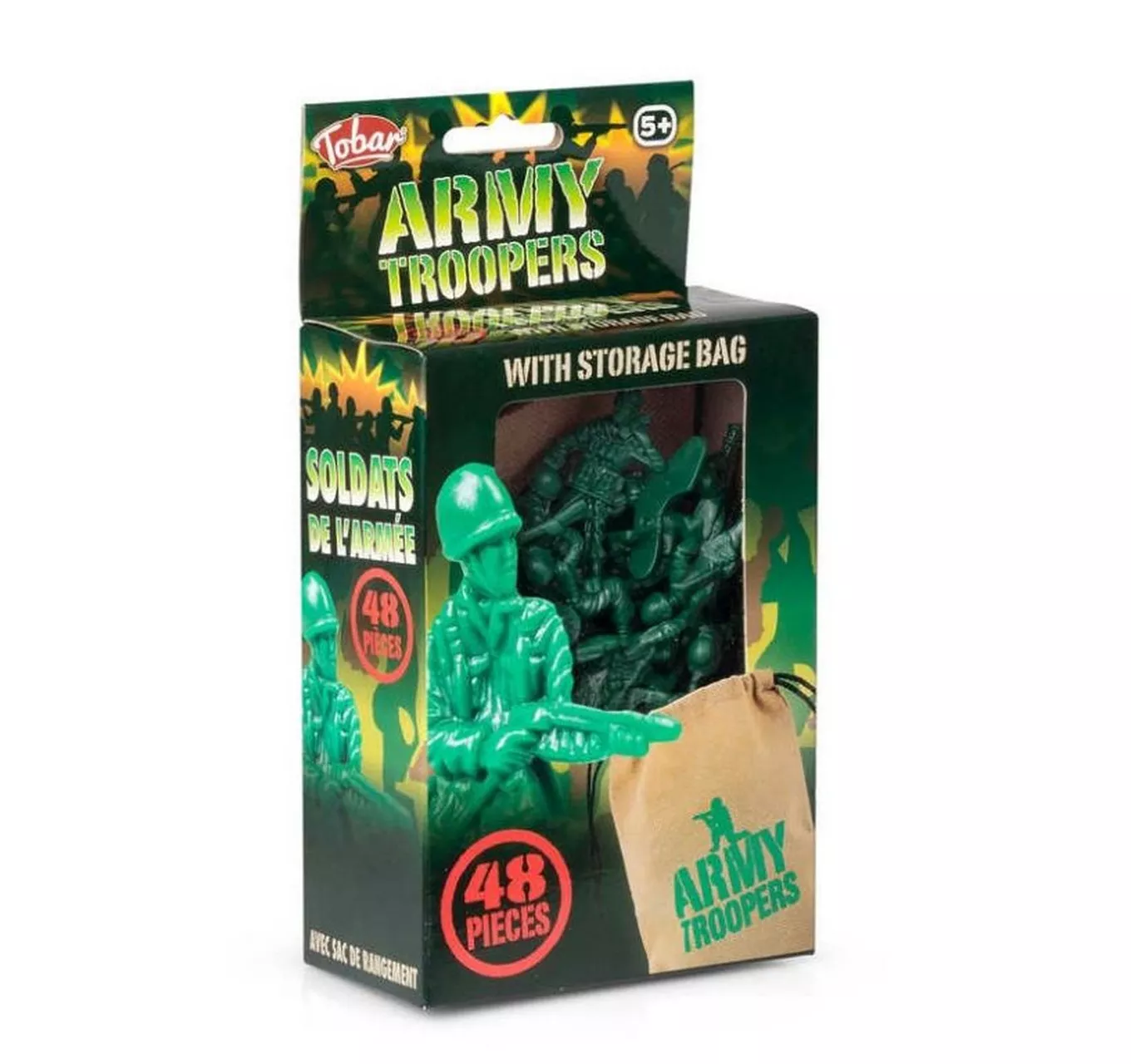 A platoon of 32 nicely-detailed plastic toy soldiers. Evoking childhood memories for many, the green soldiers are in assorted poses and carry all manner of military paraphernalia. Sure to inspire hours of play in today’s children – just like they did with their parents and grandparents. This great value product comes with a khaki-coloured, drawstring…
