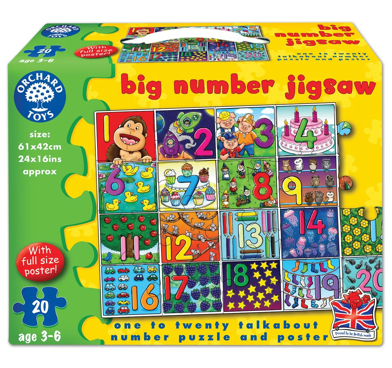 A bold and colourful jigsaw, designed to encourage number recognition and counting skills from 1-20. This fun number jigsaw is suitable to play on a table or on the floor and is full of characters and objects for children to count and discuss. Includes a full size poster of the jigsaw for use as a learning guide.