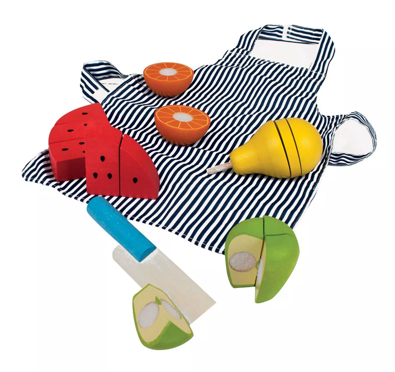 This selection of brightly coloured wooden play food can be sliced up carefully and accurately with the aid of a wooden knife. A great way to learn about kitchen safety. Includes an apron to protect our clothes in the kitchen. Bigjigs Toys wooden play food is ideal to help your little one to learn about the importance of a healthy and balanced diet, where our food comes from and how we prepare our meals. Made from high quality, responsibly sourced materials. Conforms to current European safety standards. Consists of 6 play pieces.