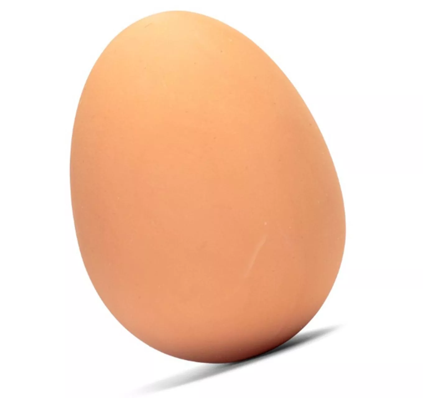 Fake egg that bounces when dropped or thrown. This imitation egg is the same shape, size and colour as a regular hen egg, but is made of the same material widely used to make bouncy balls.
