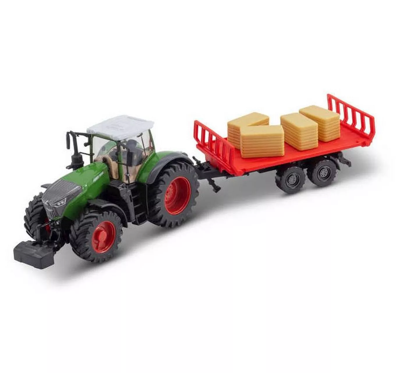 10CM FENDT 1050 VARIO TRACTOR WITH BALE TRAILER Hugely detailed model of a Fendt 1050 Vario farm tractor. The chassis and mud guard sit above four chunky wheels with authentic looking deep tread tyres. At the top of the steps is the open view cabin that features full interior details just like any other Bburago…