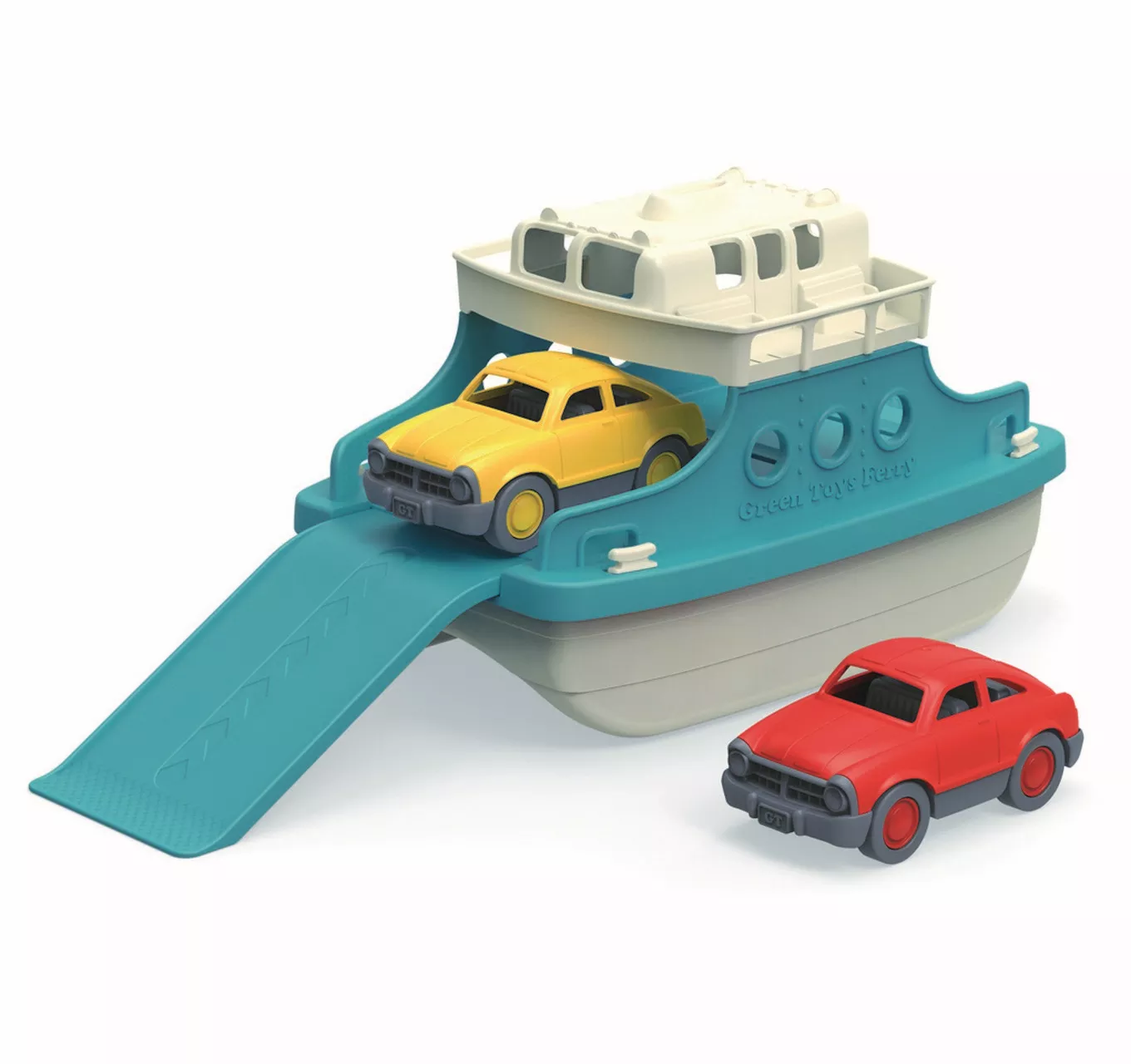 Set sail with the Green Toys Ferry Boat for a quick bathtub excursion or an extended trans-pool voyage. Whatever the adventure, this two-story vessel is ready to hit the open water with room for eco-friendly cargo galore, and even comes with two Green Toys Mini Fastbacks. Use the slide-out ramp to load up the spacious bottom level that accommodates up to four Green Toys Mini Vehicles or Fastbacks. The open top deck features two small benches on each side, as well as eleven windows looking down into the main level. This craft is ideal for any body of water durable and buoyant, the hull also detaches for easy cleaning. Safe, non-toxic; contains no BPA, PVC, phthalates or external coatings. Guaranteed to produce hours of Good Green Fun!