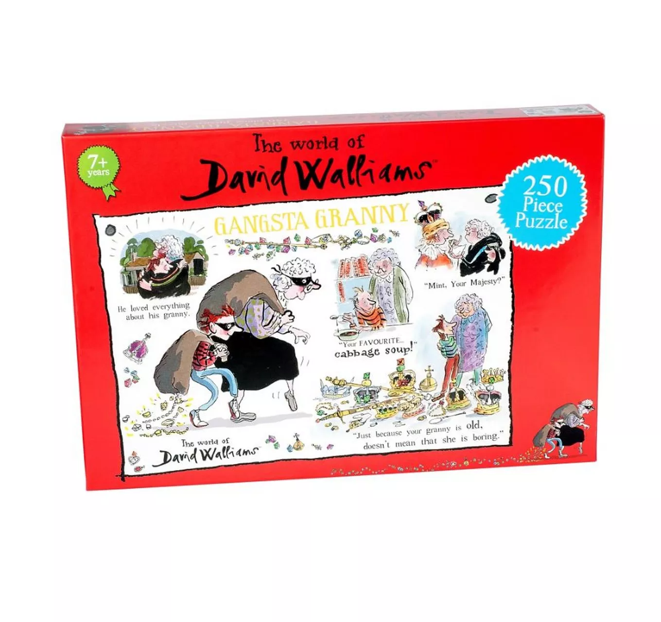Fans of David Walliams? hilarious, heart-felt children?s novels will love this fantastic Gangsta Granny 250 piece jigsaw. The World of David Walliams puzzle features some of the author?s humourous anecdotes from his number one best seller including ?Just because your Granny is old doesn?t mean that she is boring? and ?your favourite?cabbage soup!?. The entertaining puzzle also features a collage of the brilliant illustrations from the novel by the award-winning illustrator, Tony Ross. The renowned David Walliams is a comedian, actor and talent show judge but he is also one of the biggest selling children?s authors with over eight million books sold worldwide. There are four 250 piece World of David Walliams puzzles in the series including best loved titles: Grandpa’s Great Escape, Mr Stink and Billionaire Boy. The finished Gangsta Granny puzzle measures 335mm x 496mm and is suitable for aged 7 years old and over.