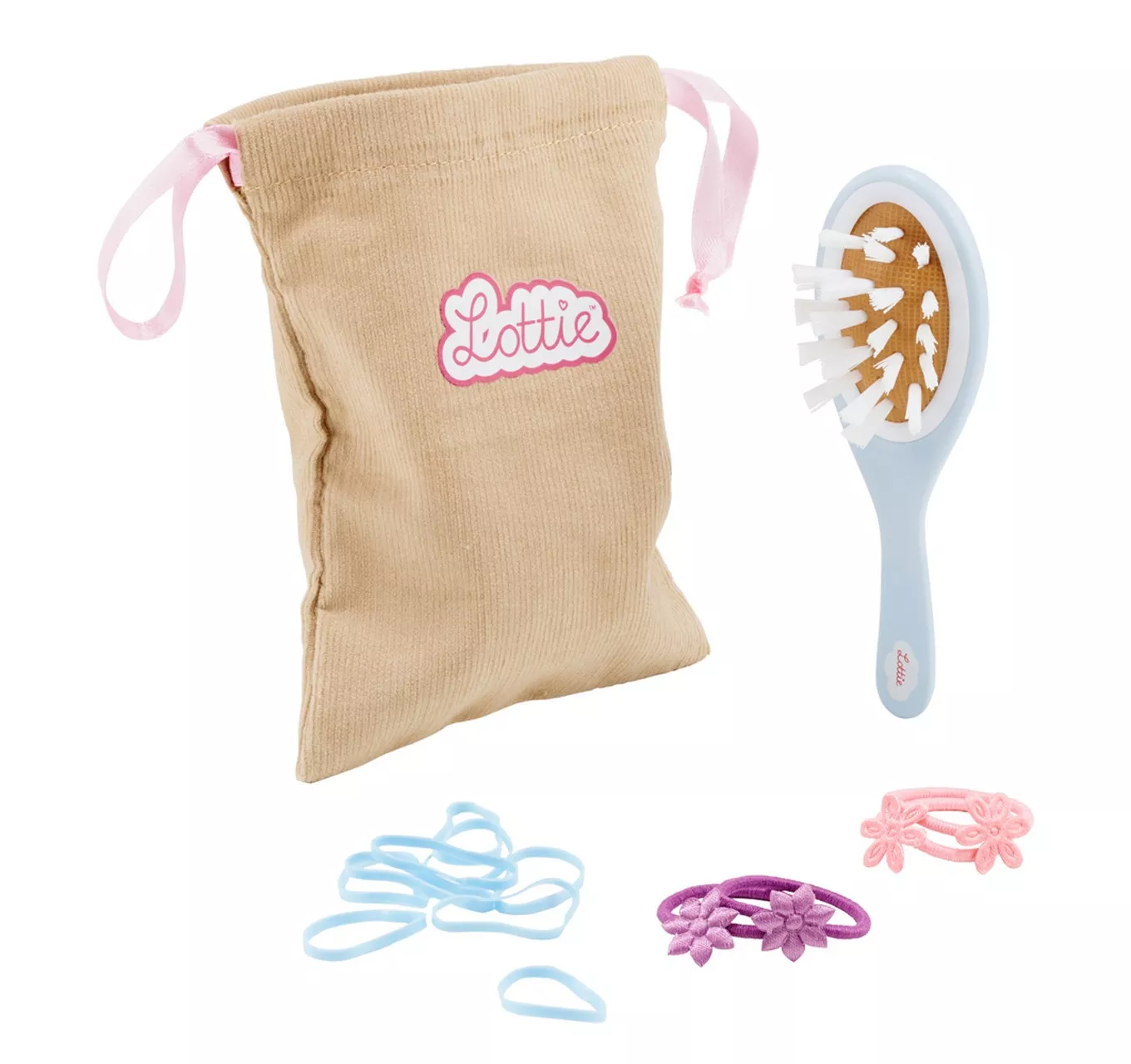 Lottie is keen to get outdoors, have fun and play sports! Lottie brushes her hair, then ties it up in a ponytail to keep it out of her eyes and face during games. Includes: • Hairbrush • Bag • 2 pink flower bands • 2 lilac flower bands • 10 blue elastic bands
