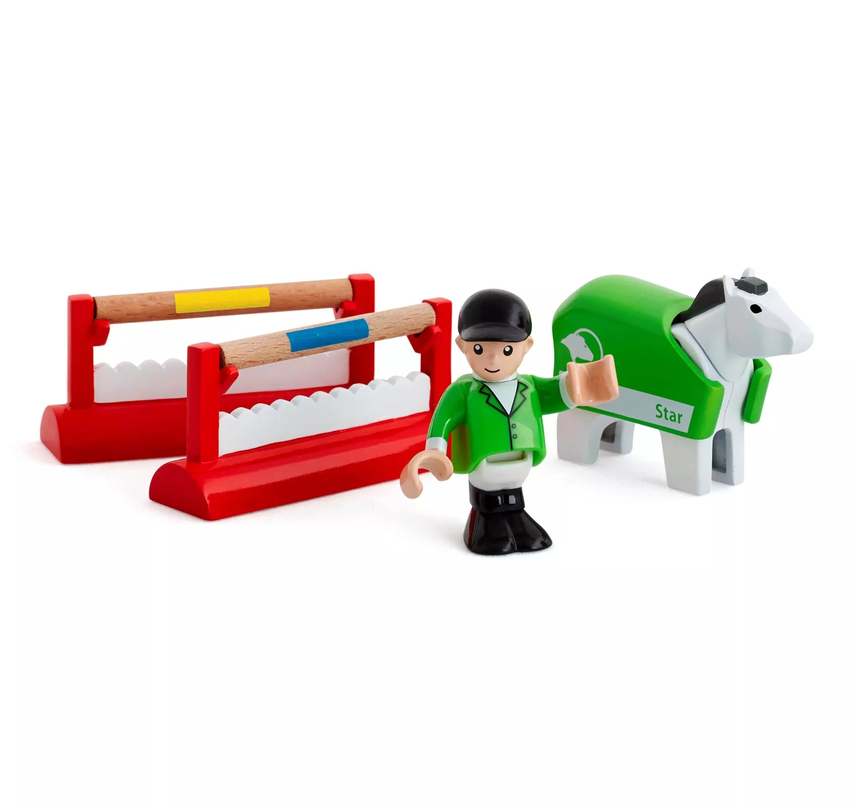 Push this equestrian tag team to the max! This challenge is nothing to toy around with. Go clean over the fences, or you’ll knock the wooden poles down. Horse’s blanket is removable to fit rider inside. Suitable for ages 3 years +