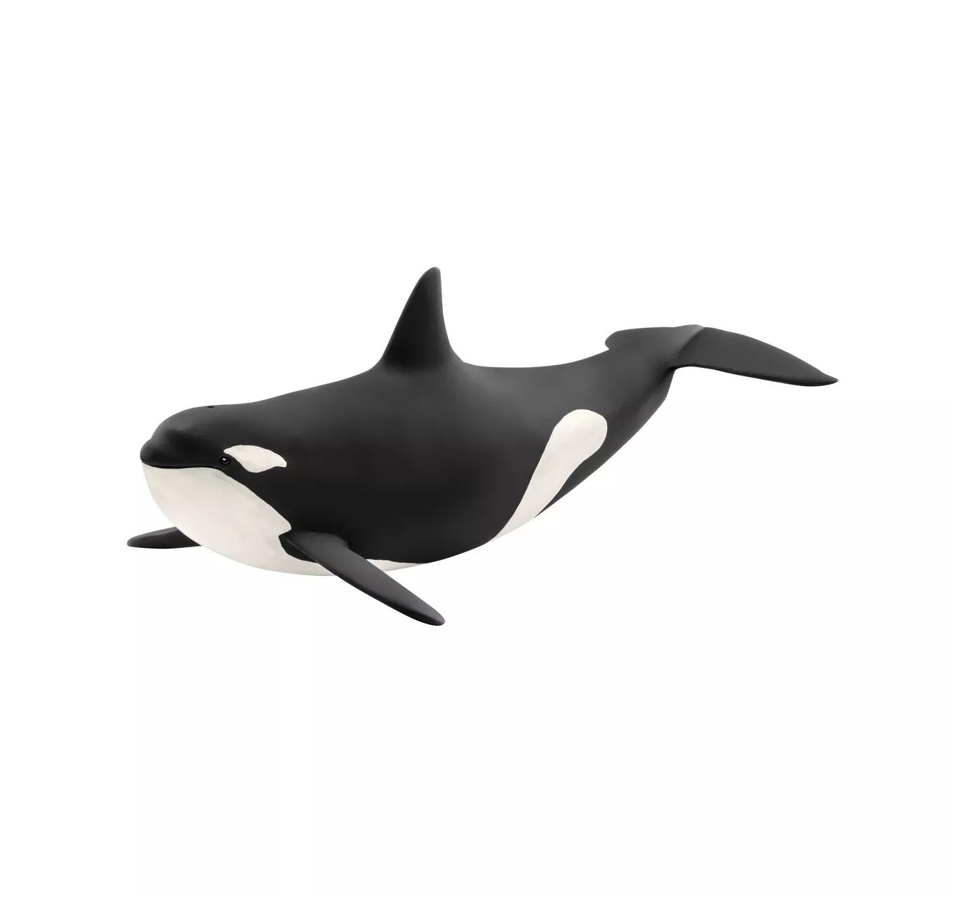 The Schleich figures are modelled with attention to detail, hand-painted with care, and provide educationally valuable playtime. The orca is a large, toothed whale that belongs to the dolphin family. Its black and white colouring makes its unmistakable. Animals swimming under it don’t recognise it, because the surface of the water is just as bright as its belly. And from above, you can hardly tell its apart from the sea floor thanks to its black back.