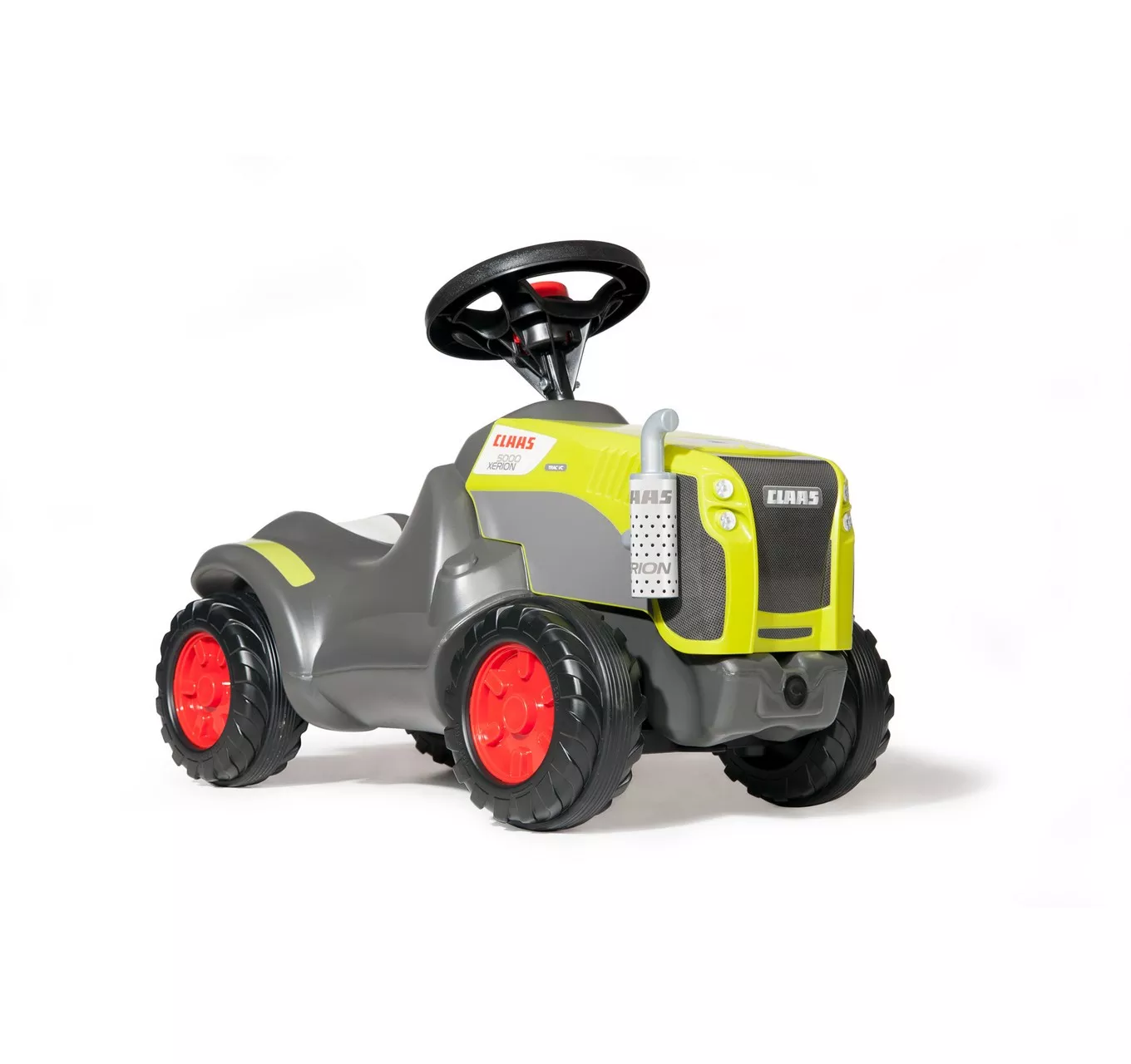 rollyMinitrac CLAAS – Sit and ride toy, tray below the open bonnet, ergonomic vehicle contour with knee recess, sturdy Ackermann steering, steering wheel with horn, whisper wheels