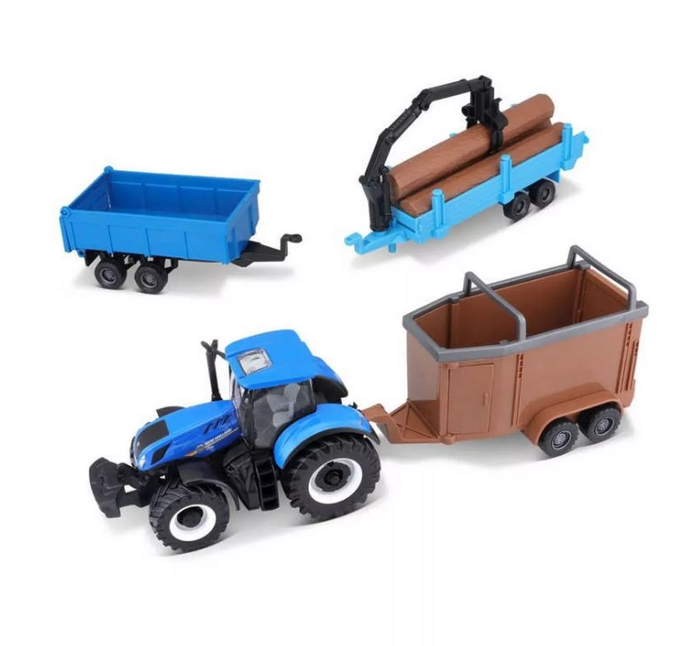 Hugely detailed model of a New Holland farm tractor. The blue chassis and mud guards sit above four chunky wheels with authentic looking deep tread tyres. At the top of the steps is the open view cabin that features full interior details just like any other Bburago model vehicle. This model includes a set of…