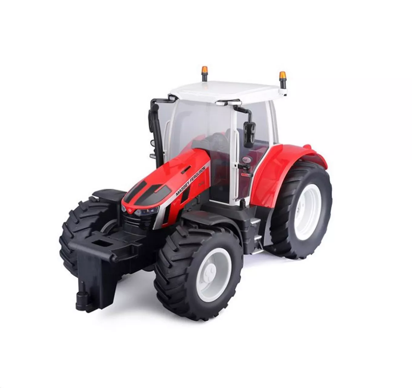 Remote control model of a tractor. This 1:16 scale RC agricultural powerhouse features full function control and is simple to steer thanks to the intuitive controller. It has chunky off-road tyres as well as front and rear connectors that can be used with a variety of popular toy trailers and farm accessories. It also operates on the 2.4GHz frequency, allowing for increased control range and use of the vehicle alongside other RC models and devices.