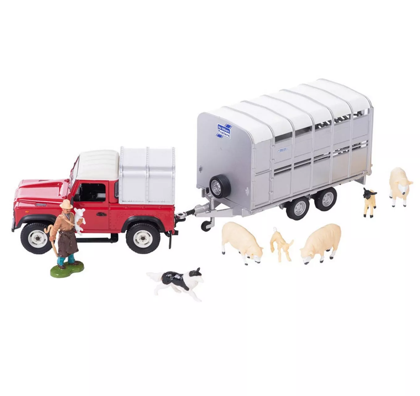 Sheep farmer play set with Landrover Defender with Ifor Williams Livestock trailer and accessories. -Authentic 1:32 scale model replica -Constructed from die cast metal and plastic -Compatible with most 1:32 scale Britains models Suitable for ages 3 Years +