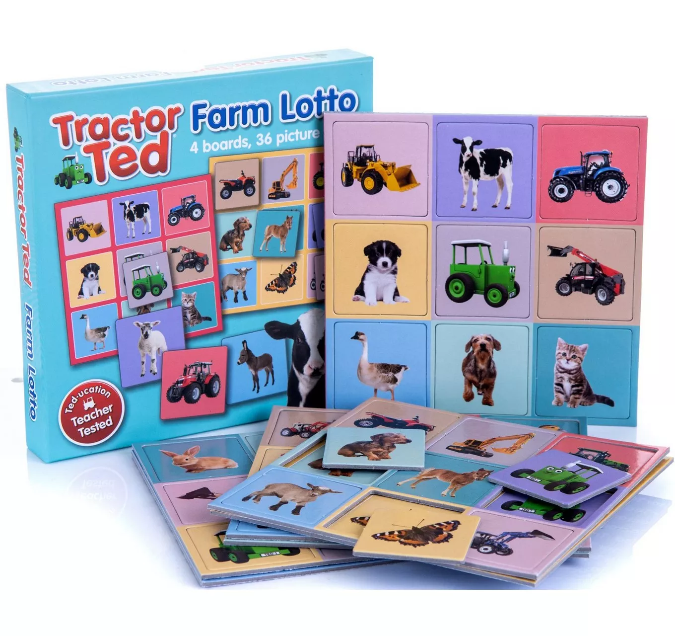 Our Farm Lotto Game is the perfect early learning matching game for young players. Including 4 sturdy farm playing boards and 36 picture cards, this fun family game features Tractor Ted and his real life farm friends including Farmer Tom, Les and Midge the dog!