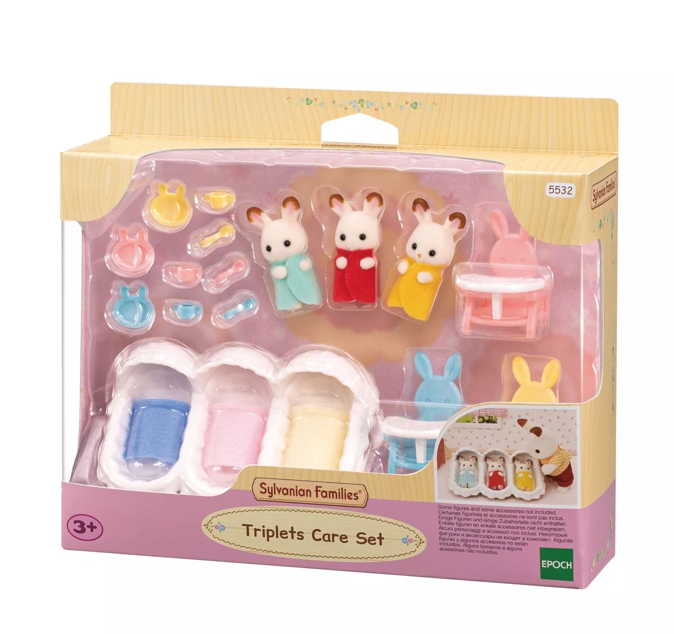 The Triplets Care Set comes with small and cute Chocolate Rabbit cradled baby Triplets and baby furniture. The set comes with furniture for looking after them, by feeding them and tucking them into bed. Includes: Chocolate Rabbit triplet (girl/red outfit), Chocolate Rabbit triplet (boy/yellow outfit), Chocolate Rabbit triplet (girl/mint green outfit), Baby chair (pink), Baby…