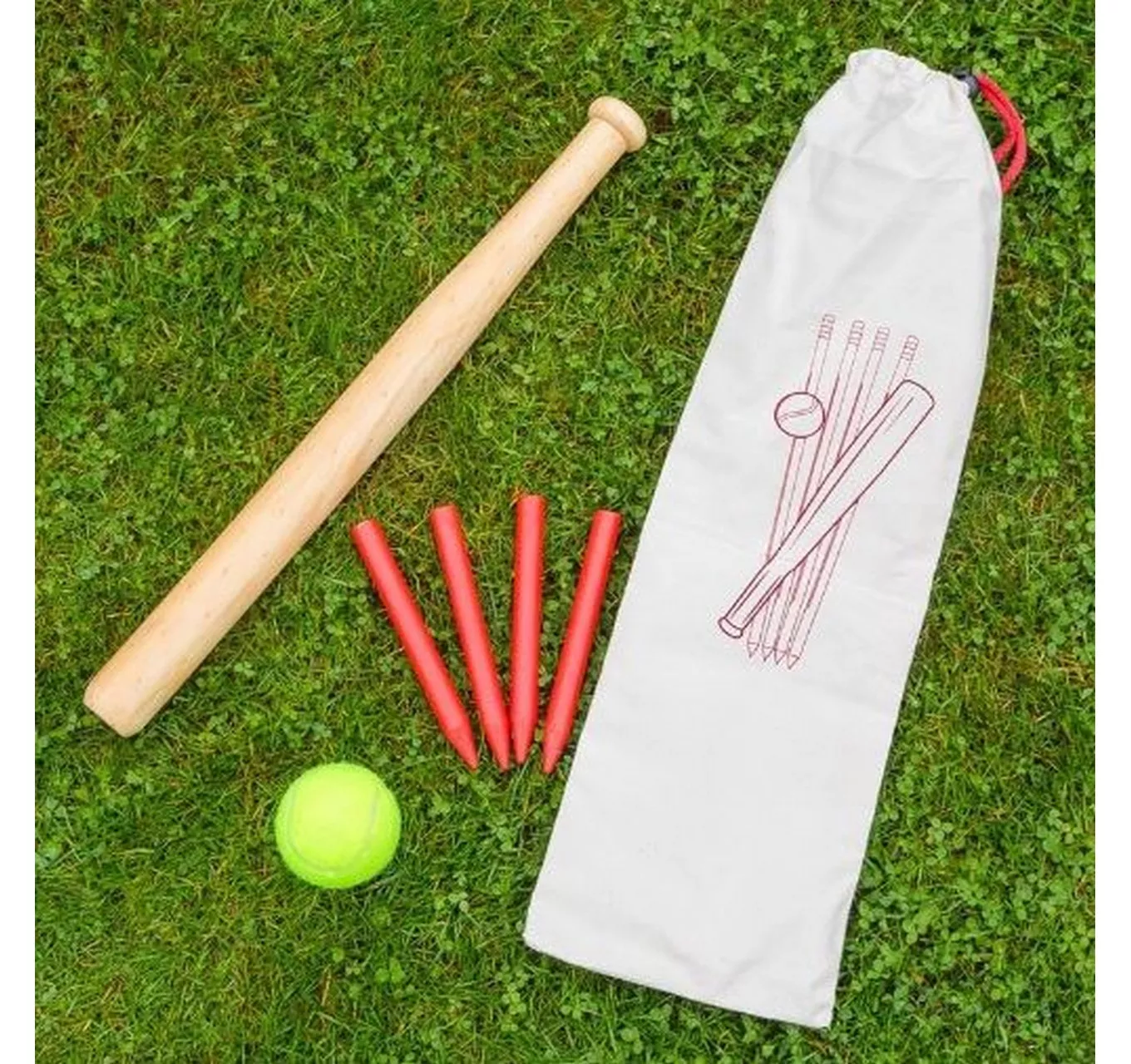 Rounders set including a ball, bat and four pegs. Push the red-tipped pegs into ground to set up the four bases then have both teams take up position on the field for a game of rounders. This set includes a printed cotton carry bag that’s handy for storage and travel.